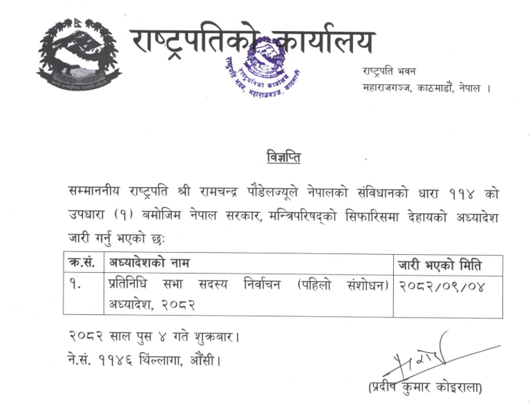 राष्ट्रपति रामचन्द्र पौडेलले सरकारको सिफारिसमा प्रतिनिधिसभा सदस्य निर्वाचनसम्बन्धी अध्यादेश, २०८२ जारी गरेका छन् । २०७८ सालको राष्ट्रिय जनगणनालाई आधार मानेर ल्याइएको यस अध्यादेशले समानुपातिक समावेशी प्रतिनिधित्वको प्रतिशत पुनःनिर्धारण गरेको छ । नयाँ व्यवस्थाअनुसार आगामी निर्वाचनमा समानुपातिकतर्फ खस–आर्यको हिस्सा केही घट्नेछ भने मधेशी र मुस्लिम समुदायको प्रतिनिधित्व बढ्नेछ । संशोधित कोटाअनुसार खस–आर्य ३०.२८ प्रतिशत, आदिवासी जनजाति २८.७२ प्रतिशत, मधेशी १६.१५ प्रतिशत, दलित १३.४४ प्रतिशत, थारू ६.५२ प्रतिशत र मुस्लिम ४.८९ प्रतिशत समानुपातिक सिट सुनिश्चित गरिएको छ ।