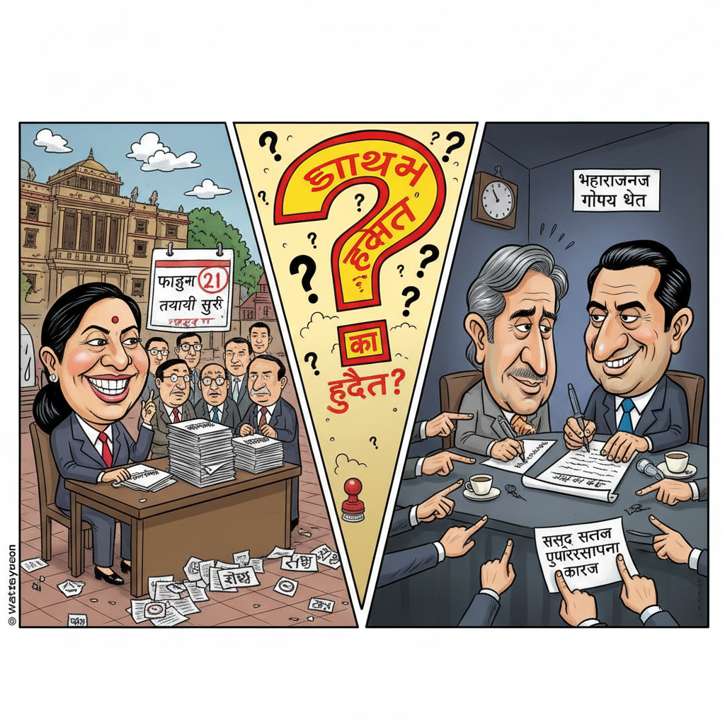 तर राजनीतिक वातावरण अझै चुनावमैत्री बनेको छैन। प्रमुख दलहरू नै मानसिक र राजनीतिक रूपमा तयार नभएको संकेत दिइरहेका छन्। कांग्रेस र एमालेले आयोगमा दल दर्ता गराए पनि सर्वोच्च अदालतमा प्रतिनिधिसभा पुनर्स्थापनाको रिट दायर गरेका छन्। बहुमत सांसदको हस्ताक्षरसहित पूरक निवेदन लैजाने तयारी छ। महाराजगञ्ज भेट यसैसँग जोडिएको छ। १५० भन्दा बढी सांसदको हस्ताक्षरले अदालतलाई कानुनी र मनोवैज्ञानिक दबाब दिन खोजिएको छ। यो दोहोरो रणनीतिले चुनावप्रति शंका बढाएको छ।