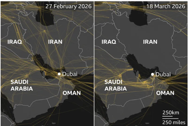 मध्यपूर्वमा भएको सैन्य तनावपछि क्षेत्रीय आकाशमार्ग बन्द हुँदा हजारौं उडानहरू प्रभावित भएका छन्। विशेष गरी एमिरेट्स,एतिहाद एयरवेज,कतार एयरवेज जस्ता प्रमुख गल्फ एयरलाइन्सका उडानहरू ठप्प भएका थिए। यसले दुबई, अबुधाबी र दोहा विमानस्थलहरूमा हजारौं यात्रु अलपत्र परे।ऊर्जा आपूर्तिमा समेत समस्या देखिएको छ। होर्मुज जलडमरू बन्दजस्तै भएपछि जेट इन्धनको अभाव सिर्जना भएको छ, जसले इन्धन मूल्य दोब्बर बनाएको छ। यसले एयरलाइन्सहरूलाई उडान कटौती गर्न बाध्य बनाएको छ र आगामी दिनमा हवाई भाडा बढ्ने सम्भावना देखिएको छ।गल्फ क्षेत्रको विमानन मोडेल मुख्यतः ट्रान्जिट यात्रुमा आधारित छ, जहाँ यात्रुहरू एक ठाउँबाट अर्को ठाउँमा जाँदा यहाँ छोटो समयका लागि ट्रान्जिट हुन्छन्। दुबईमा मात्रै करिब ४७% यात्रु ट्रान्जिटका लागि आउने गर्छन्। तर हालको असुरक्षा र अनिश्चितताले यात्रुहरूलाई वैकल्पिक मार्ग रोज्न प्रेरित गर्न थालेको छ।