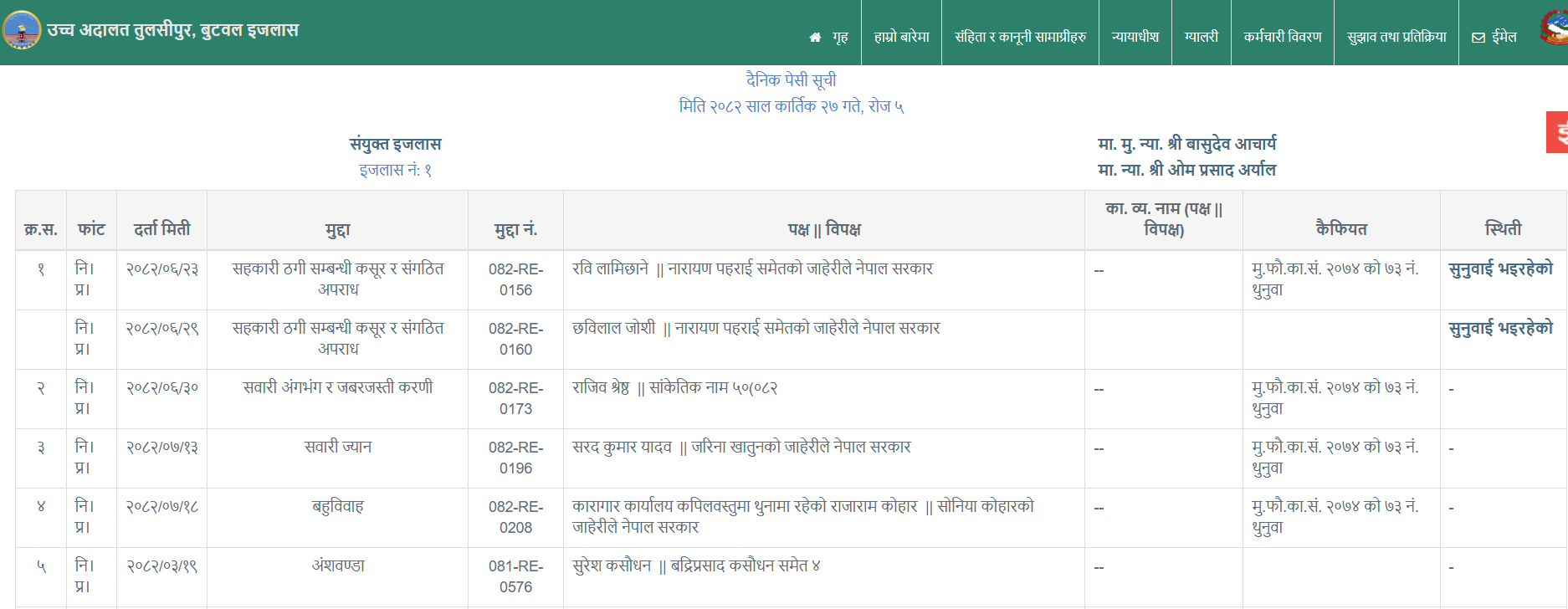 राष्ट्रिय स्वतन्त्र पार्टीका सभापति रवि लामिछानेसहितको सुप्रिम सहकारी ठगी मुद्दाको सुनुवाइ बुटवल उच्च अदालतमा संयुक्त इजलासमा हुँदैछ। न्यायाधीश ओमप्रकाश अर्याल र वासुदेव आचार्यको संयुक्त इजलासले यो मुद्दाको सुनुवाइ गर्दैछ। यसै इजलासमा पूर्व गोर्खा मिडिया सञ्चालक तथा पूर्व डिआइजी छविलाल जोशीको मुद्दा पनि संयुक्त रूपमा सुनुवाइ भइरहेको छ। ![]()