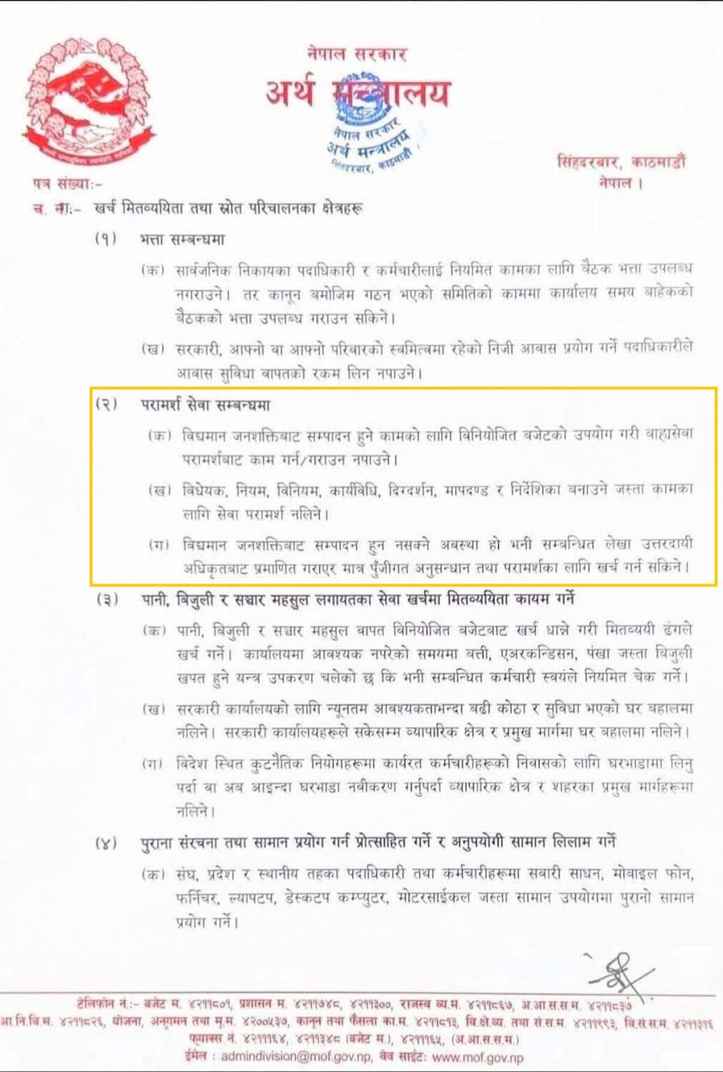 काठमाडौं, २५ सेप्टेम्बर २०२५ । नेपाल सरकारले विकास आयोजनाहरूमा अनावश्यक परामर्शदाता सेवालाई कडा नियन्त्रण गर्ने निर्णय गरेको छ । शुशिला कार्की नेतृत्वको मन्त्रिपरिषद् बैठकले विद्यमान जनशक्तिबाट सम्पादन हुन सक्ने कामहरूमा बाह्य परामर्शदाता नियुक्त गर्न प्रतिबन्ध लगाएको हो । यो निर्णयले वैदेशिक सहायता र सरकारी बजेटबाट सञ्चालित आयोजनाहरूमा व्याप्त 'बौद्धिक बिचौलिया' को जालोलाई तोड्ने अपेक्षा गरिएको छ । विगतका वर्षहरूमा यस्ता परामर्श सेवामा अर्बौं रुपैयाँको दुरुपयोग भएको महालेखा परीक्षकको प्रतिवेदनले औंल्याएको छ, जसले लक्षित विकासभन्दा सीमित समूहलाई फाइदा पुर्याएको थियो ।यो निर्णयअनुसार, अब आयोजनाहरूले स्वदेशी वा विदेशी परामर्शदाता सेवालाई पूर्णतः रोक्नुपर्नेछ, यदि उनीहरूको काम सरकारी कर्मचारीहरूबाटै सम्भव छ भने । बैठकले विधेयक, नियमावली, कार्यविधि, दिग्दर्शन, मापदण्ड र निर्देशिका तयार गर्ने जस्ता आधारभूत कामहरूमा पनि बाह्य सहायता लिन नपाइने स्पष्ट गरेको छ । यदि कुनै काम विद्यमान जनशक्तिबाट सम्पादन हुन नसक्ने अवस्था भएमा, सम्बन्धित लेखा उत्तरदायी अधिकृतबाट प्रमाणित गरेर मात्र पुँजीगत अनुसन्धान वा परामर्शका लागि बजेट खर्च गर्न सकिनेछ । यो कदमले सरकारी खर्चमा पारदर्शिता बढाउने र स्वदेशी क्षमताको विकासलाई प्रोत्साहन दिने विश्वास गरिएको छ ।हाम्रो अनुसन्धानले देखाएअनुसार, 'बौद्धिक बिचौलिया' भनेर चिनिने सीमित व्यक्ति वा समूहहरूले एउटा मन्त्रालयको वार्षिक बजेटबराबरको रकम परामर्श सेवाको नाममा लग्दै आएका थिए । विशेषगरी वैदेशिक ऋण र अनुदानबाट सञ्चालित आयोजनाहरूमा कुल बजेटको ३५ प्रतिशतसम्म यस्ता बिचौलियाहरूले विभिन्न शर्त राखेर 'बाँडिचुडी' गर्दै आएका छन् । कुनै आयोजनामा त यो प्रतिशत ४५ भन्दा बढी पुगेको पाइएको छ । यसले गर्दा, लक्षित जनता वा विकास कार्यभन्दा यी बिचौलियाहरूले नै ठूलो फाइदा उठाउँदै आएका छन् ।