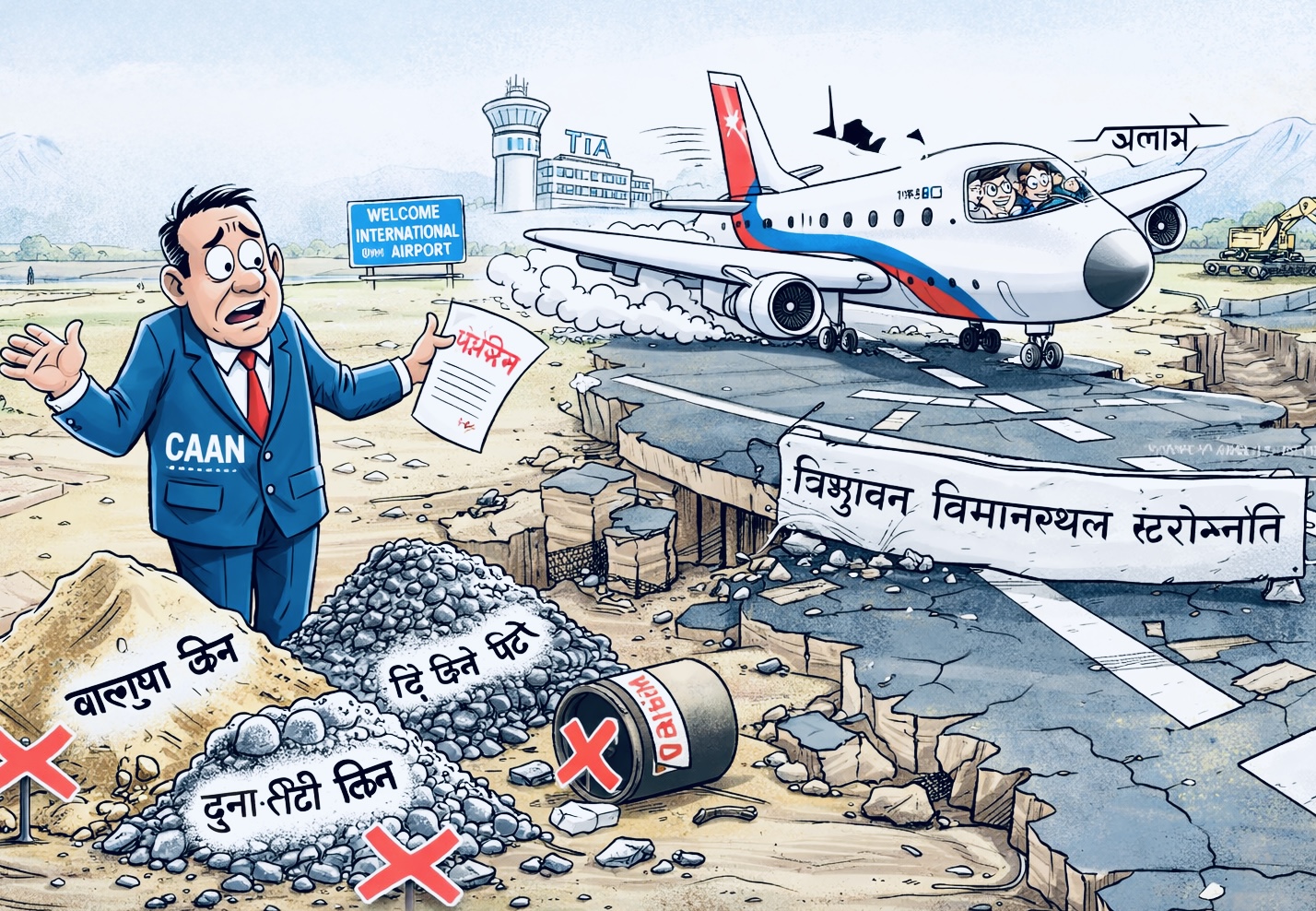 नागरिक उड्डयन प्राधिकरणको ठेक्का पूर्वतयारीमै देखिएको लापरवाहीका कारण कच्चा निर्माण सामग्रीको अभावले अरबौँ रुपैयाँ बराबरको त्रिभुवन अन्तर्राष्ट्रिय विमानस्थल स्तरोन्नति परियोजना गम्भीर संकटमा परेको छ। नेपालकै एक मात्र अन्तर्राष्ट्रिय हवाई प्रवेशद्वारका रूपमा रहेको यो विमानस्थलको धावनमार्ग, ट्याक्सी–वे, पार्किङ एप्रोन तथा अन्य भौतिक पूर्वाधार स्तरोन्नतिका लागि बहुवर्षीय योजना अघि बढाइए पनि आवश्यक कच्चा पदार्थको सुनिश्चितता नगरी ठेक्का प्रक्रिया अगाडि बढाइँदा परियोजना समयमै सम्पन्न नहुने जोखिम बढेको छ। विमानस्थल स्तरोन्नति केवल विकासको विषय मात्र नभई उडान सुरक्षा, अन्तर्राष्ट्रिय छवि र राष्ट्रिय क्षमतासँग जोडिएको संवेदनशील विषय भए पनि योजनागत कमजोरीका कारण यो परियोजना अलपत्र पर्ने अवस्थामा पुगेको छ।