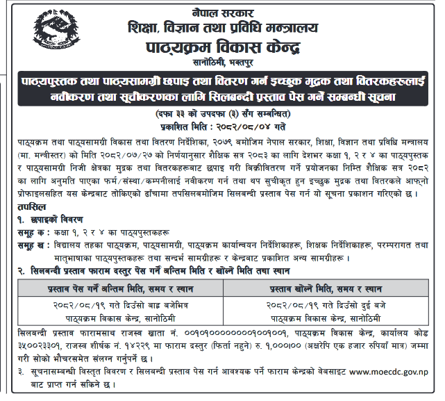 यो निर्णय मन्त्रालयको कात्तिक २७ गते बसेको मन्त्रीस्तरीय बैठकको स्वीकृतिमा आधारित छ । यसअन्तर्गत विशेष गरी कक्षा १, कक्षा २ र कक्षा ४ का सबै विषयका पाठ्यपुस्तकहरू निजी क्षेत्रबाट छपाइ गरी देशभर बिक्री–वितरण गरिनेछ । यसअघि शैक्षिक सत्र २०८२ मा अनुमति पाएका पुराना फर्म/कम्पनीहरूले नवीकरण गर्न सक्नेछन् भने नयाँ मुद्रक तथा वितरकहरू पनि सूचीकृत हुन आवेदन दिन सक्नेछन् ।केन्द्रले छपाइ तथा प्रकाशनका कामलाई दुई समूहमा विभाजन गरेको छःसमूह ‘क’ : कक्षा १, २ र ४ का सबै पाठ्यपुस्तकहरू,समूह ‘ख’ : पाठ्यक्रम दस्तावेज, शिक्षक निर्देशिका, कार्यान्वयन निर्देशिका, मातृभाषा तथा परम्परागत पाठ्यपुस्तक, सन्दर्भ सामग्री तथा केन्द्रबाट प्रकाशित अन्य सामग्रीहरू