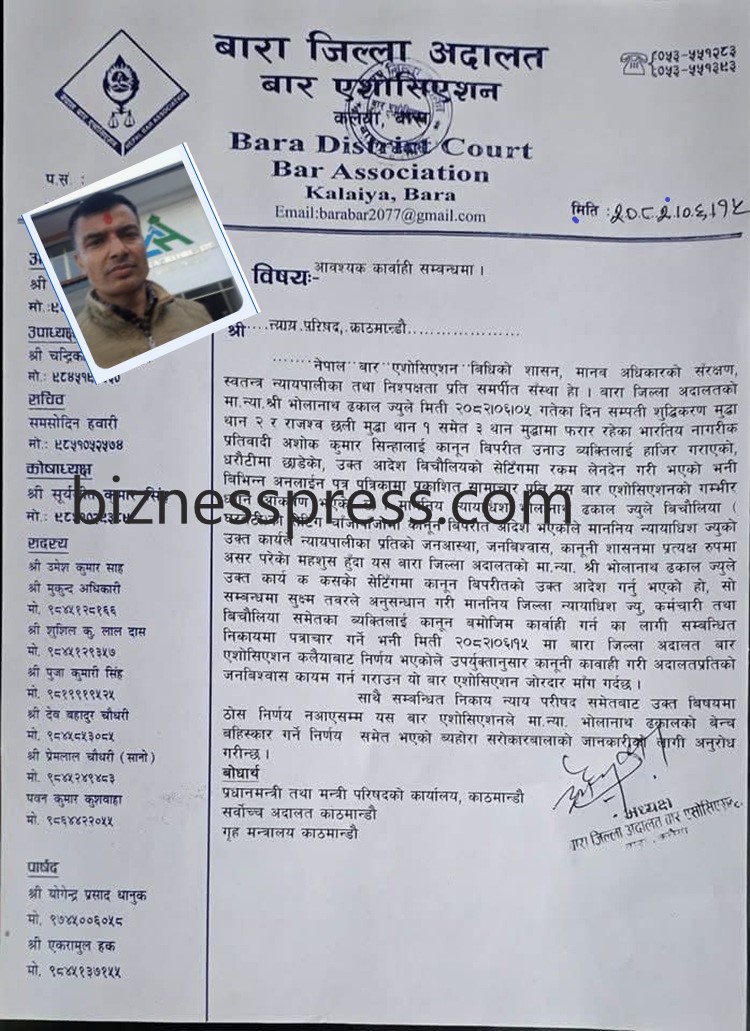 काठमाडौं – राजस्व छली र सम्पत्ति शुद्धीकरणसम्बन्धी मुद्दामा प्रतिवादीको उपस्थिति नै नभई धरौटीमा रिहा गर्ने विवादास्पद आदेश दिएपछि बारा जिल्ला अदालतका न्यायाधीश भोलानाथ ढकाल न्यायपरिषद्मा काजमा तानिएका छन्। सर्वोच्च अदालतले उनलाई न्यायपरिषद्मा हाजिर हुने गरी काज गरेको हो।सर्वोच्च अदालतका एक वरिष्ठ अधिकारीले अनौपचारिक कुराकानीमा भने, “उहाँको आदेश विवादमा परेकाले अहिलेलाई काजमा तानिएको छ। थप छानबिन र कारबाहीको प्रक्रिया न्यायपरिषद्ले अघि बढाउँछ।” यो कदम न्यायिक प्रणालीमा पारदर्शिता र जवाफदेहिता कायम राख्नका लागि चालिएको बताइएको छ।मुद्दाको सन्दर्भमा, भारतीय नागरिक एक प्रतिवादीविरुद्ध राजस्व छली र सम्पत्ति शुद्धीकरणको गम्भीर आरोप थियो। उनी अदालतमा उपस्थित नभए पनि न्यायाधीश ढकालले धरौटीमा छाड्ने आदेश जारी गरेका थिए। यो आदेशले कानुनी प्रक्रिया र न्यायिक मान्यतामाथि प्रश्न उठाएको छ। जिल्ला अदालत बार एसोसिएसनले तत्कालै यो विषयमा ध्यानाकर्षण गर्दै न्यायाधीश ढकालविरुद्ध कारबाहीको माग गर्दै विज्ञप्ति जारी गरेको थियो। बारले कारबाही नगरे इजलास नै बहिष्कार गर्ने चेतावनीसमेत दिएको थियो।